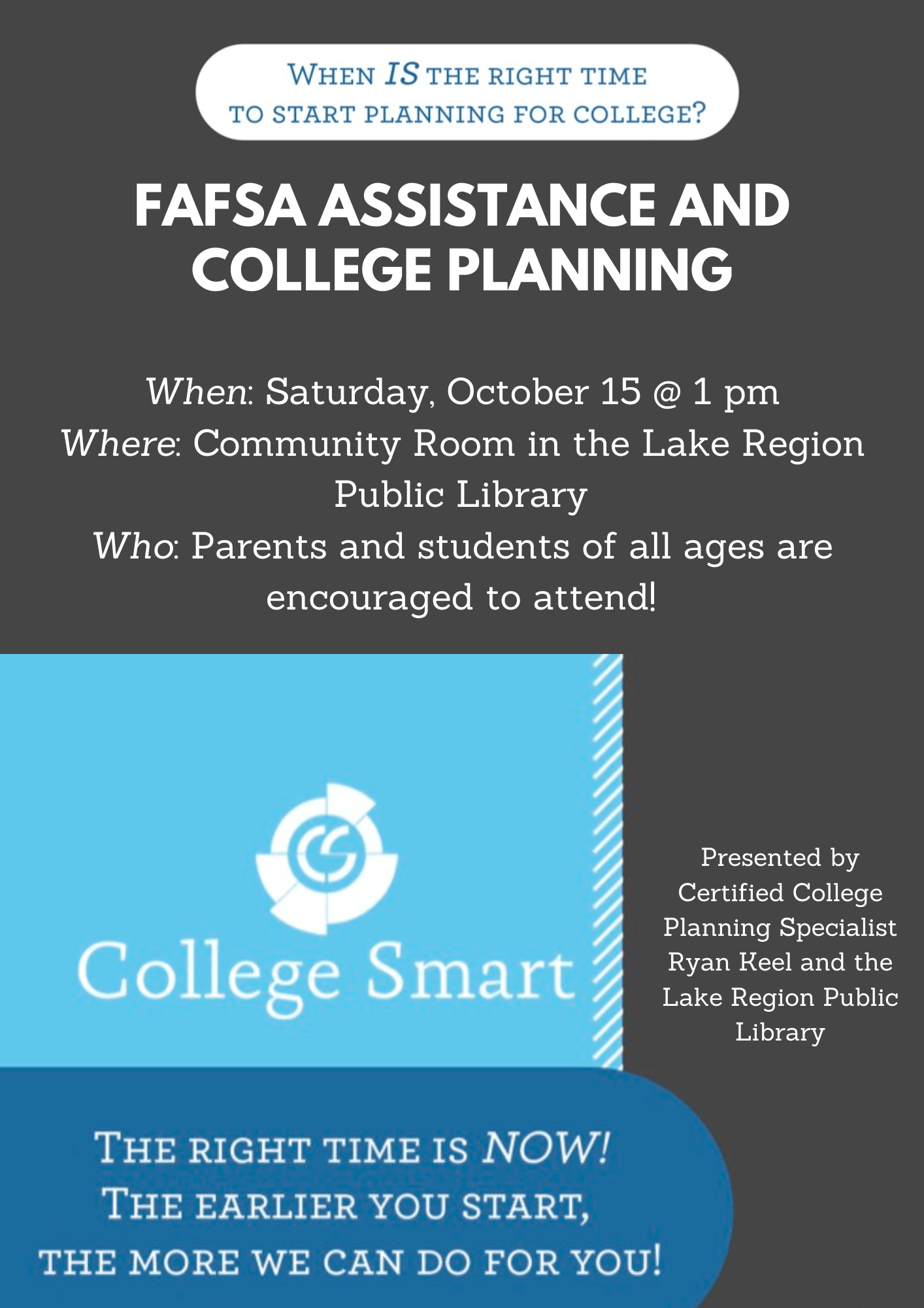 The Lake Region Public Library is excited to welcome Certified College Planning Specialist Ryan Keel for a FREE information session regarding the FAFSA and college planning. Join us at 1:00 pm on Saturday, October 15 in the Community Room for an exciting and incredibly informative session. Come with questions!