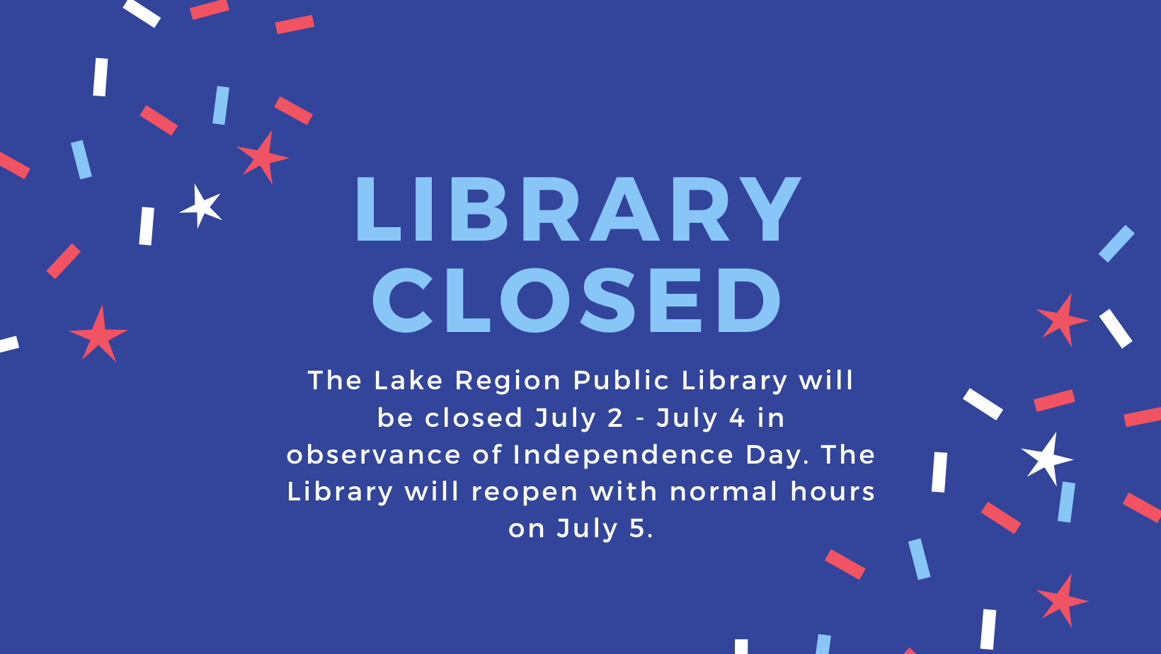 The Lake Region Public Library will be closed Saturday, July 2 through Monday, July 4 in observance of Independence Day. The Library will reopen with normal hours on Tuesday, July 5. Have a safe and happy holiday!