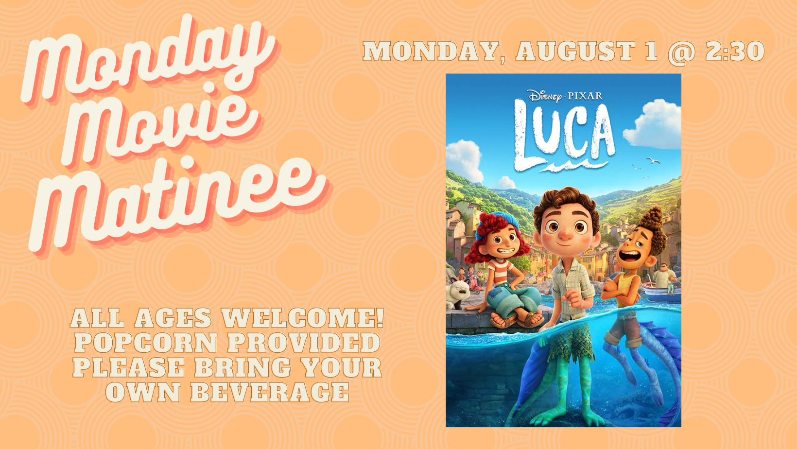 FeaturedLake Region Public Library 423 7th Street Northeast, Devils Lake, ND, United StatesJoin us in the Community Room on Monday, August 1 at 2:30 pm for a free showing of Luca! Popcorn will be provided, please bring your own beverage. All ages welcome!