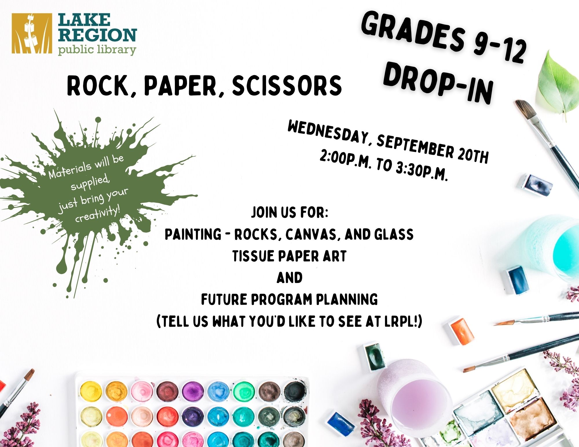 FeaturedLake Region Public Library 423 7th Street Northeast, Devils Lake, ND, United StatesFriends in grades 9-12 are invited to a drop-in event on Wednesday, September 20 from 2-3:30 pm! Stop by or stay for the whole time, we have tons of fun … Continue reading September Drop-In: Grades 9-12